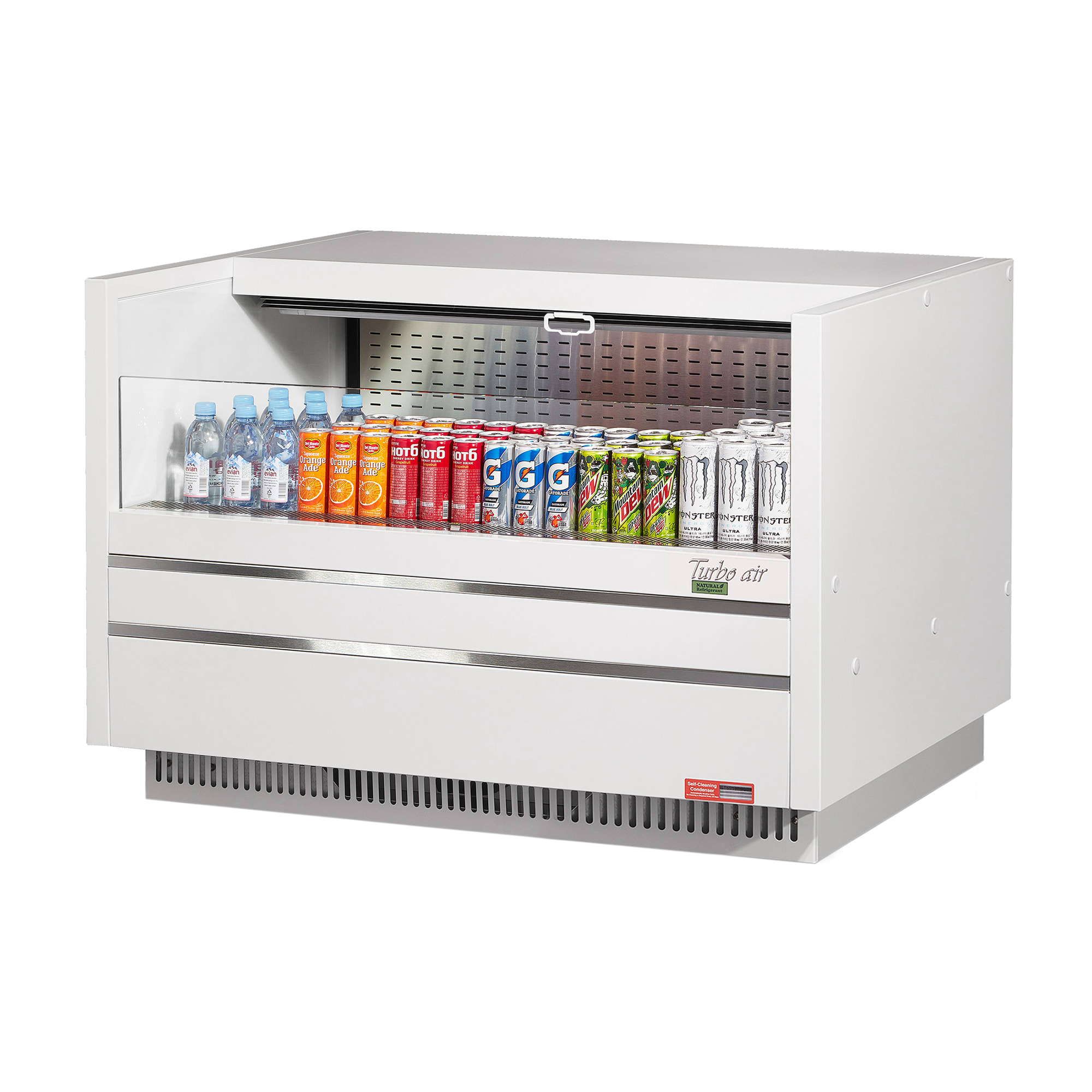This drop-in horizontal open display case from Turbo Air features a modern design and is perfect for enhancing impulsive sales. Ideal for eye-catching displays and convenient access with fast service in high traffic areas. This unit features a stainless steel interior including back wall and deck pans, perforated interior back wall and open top for improved airflow, LED interior lighting and a solar powered digital thermometer.
