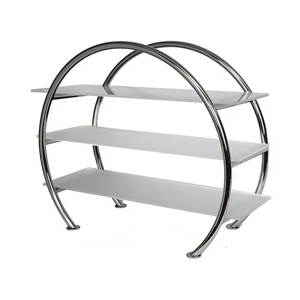 The Eastern Tabletop Stand is a sophisticated 3-tier circular tabletop display stand, perfect for showcasing appetizers, samples, and desserts at events and parties. Made from heavy-duty 18/10 stainless steel, it features a modern, mirror-finish frame that adds a touch of elegance to any food presentation. The stand includes three durable acrylic shelves with a frosted finish to minimize streaks and fingerprints, ensuring a professional look. With double-sided accessibility, guests can easily access treats from either side of the display.