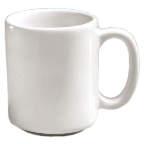 This 10 ounce Houston is white and made from vitrified china. Our mugs and cups are constructed using a one‐piece process that makes them more durable.