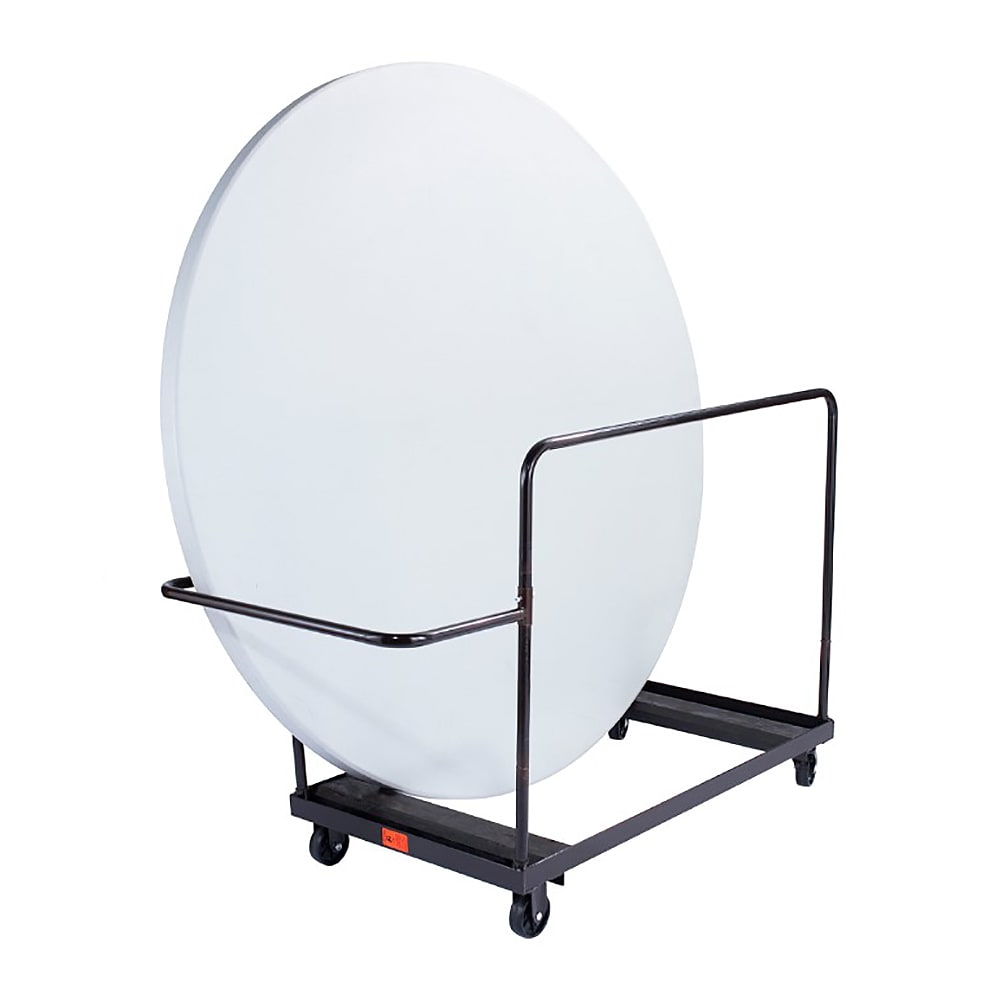 This dolly from National Public Seating is the ultimate solution for effortless transportation and storage of folding tables. The DY-71R Dolly stores and moves round folding tables with ease. Stack up to 10 vertically upright 71" round tables on this sturdy, tubular steel dolly. The brown scratch-resistant powder-coated paint finish resists chipping even after years of rigorous use. This dolly has two handles, one front handle and four hard rubber casters (two that swivel) for easy maneuvering. Each caster boasts a 165 lb. weight capacity for a total of 660 lbs. Meets MAS Certified Green environmental industrial requirements.