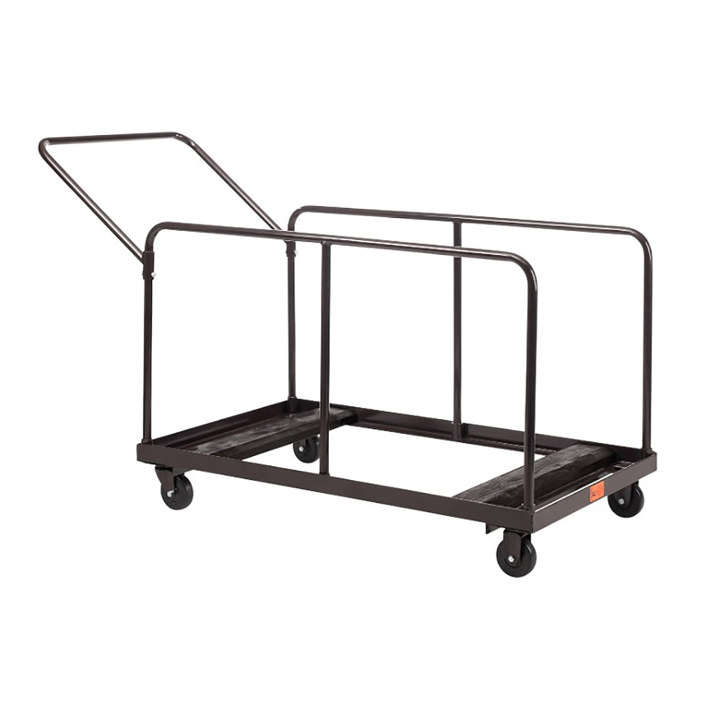 The DYMU Multi-Use Dolly from National Public Seating easily stores and transports round & rectangular folding tables. Stack up to 10 vertically upright round or rectangular tables (48-60 diameter; 72-96 length) on this sturdy, tubular steel dolly. The brown scratch-resistant powder-coated paint finish resists chipping even after years of rigorous use. This dolly has two side handles, a convenient handlebar and four hard rubber casters (two that swivel) for easy maneuvering. Each caster boasts a 165 lb. weight capacity for a total of 660 lbs. Meets MAS Certified Green environmental industrial requirements.