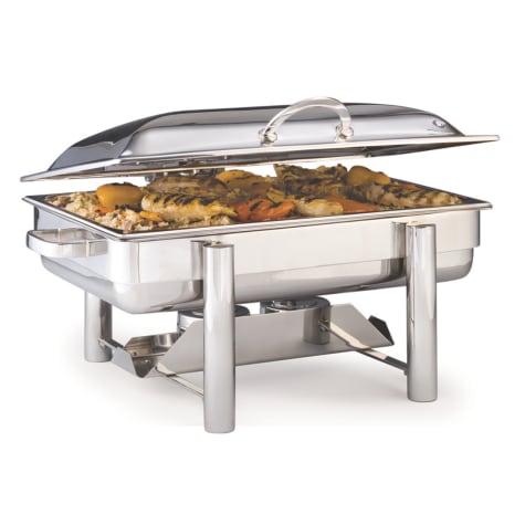 This D.W. Haber & Son 8 quart rectangular chafer features a hinged lid that stays open for easy service and the elegant Tempo design.