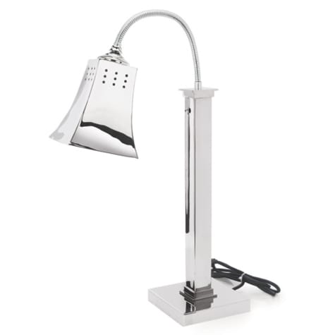 This Eastern Tabletop Lamp Warmer has a single head design and a square base for better stability. The head is flexible, allowing for it to be positioned for precise heating.