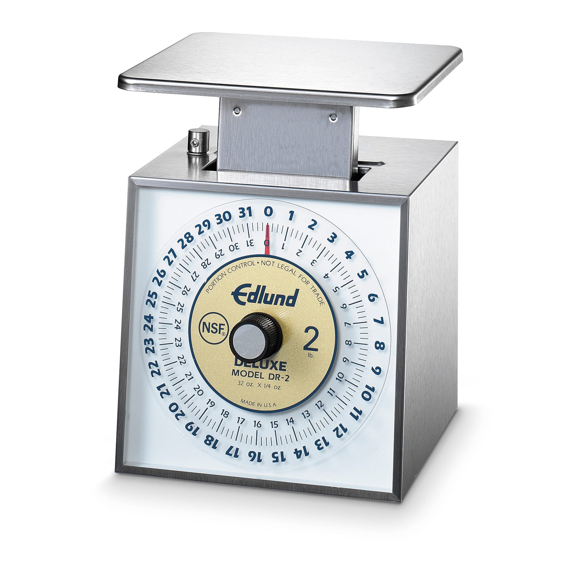 This is Edlund's most popular line of all stainless portion control scales. The newly designed all stainless steel construction allows for dishwasher safe cleaning without the need to disassemble the scale. The DR‐2 rotating dial standard mechanical scale is part of the Premier Series. The Dr‐2 Deluxe features a 6" x 6‐3/4" stainless steel platform with a capacity of 32 oz x 1/4 oz and air dashpot for instant readings.