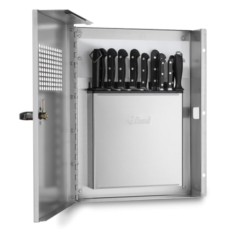 This Edlund knife cabinet constructed from heavy duty 14 gauge stainless steel and features a stainless steel piano hinge and tamper‐proof screws. A front view window permits immediate knife inspection. It has a keyed lock and additional padlock holes for additional security.