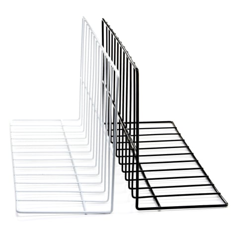 Keep your shelves organized with this wire shelf divider from Darling Foodservice. It is 8" x 12" x 28" and is perfect for display cases or merchandisers. This wire divider is vinyl coated and is white in color.