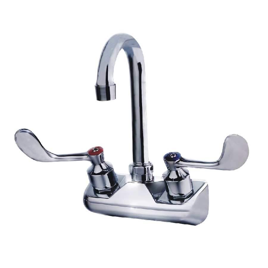 This standard duty wall mount faucet features a 3‐1/2" swing gooseneck spout and wrist blades.