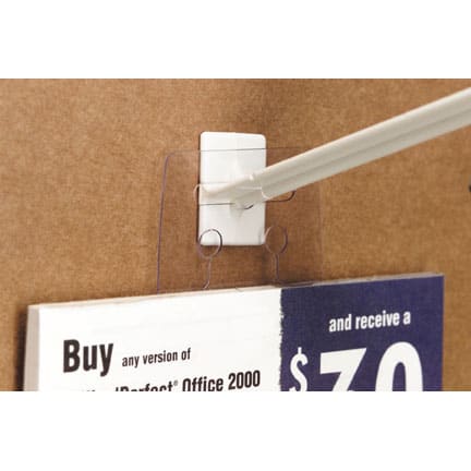 This Versa‐Clip® has a butterfly hole and an adhesive liner on both sides that allows for easy mounting on hooks, shelf channels and most flat surfaces.