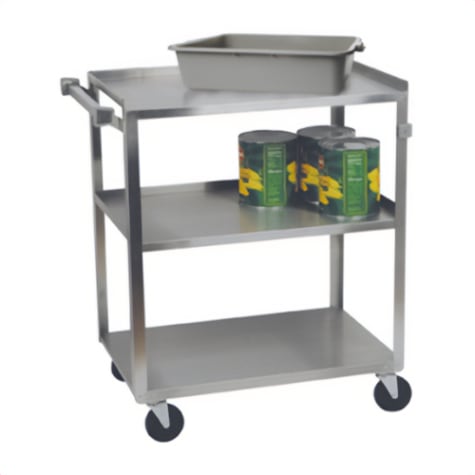 This Darling Foodservice utility cart features durable welded construction, reinforced shelves, and swivel casters for easy maneuvering. It has bumpers on the legs and handle to prevent damage to walls. Ideal for transporting dishes, dry good, and more.