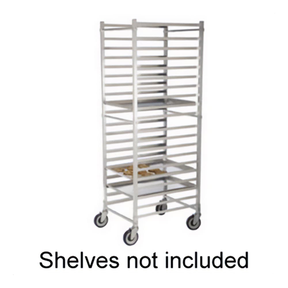 This Darling Foodservice Sheet Pan Rack has a 20 pan capacity and is made from ultra‐strong aluminum. It has ribbed slides for easier loading and unloading, and 5" swivel casters for easy transportation.