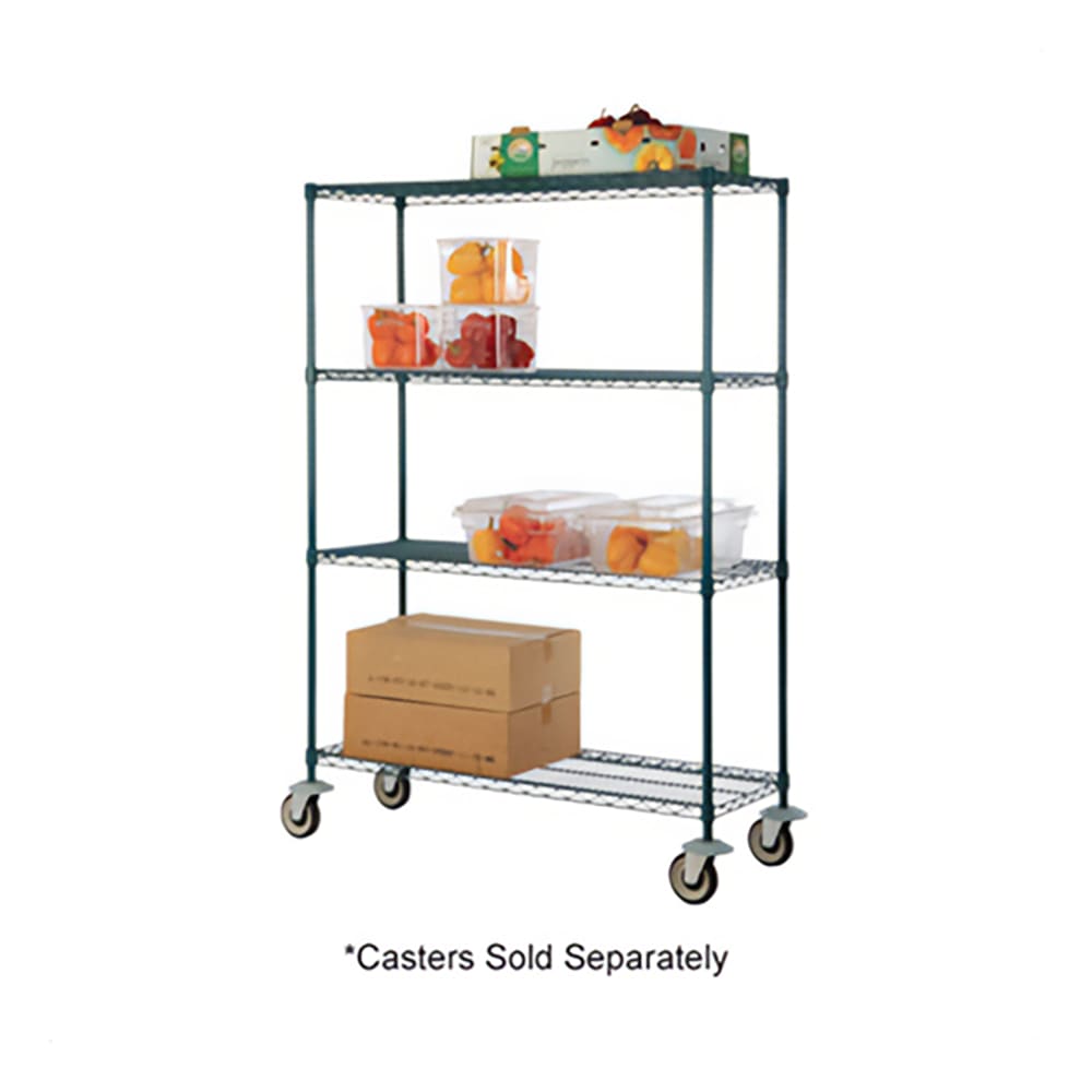 Easy to assemble, this shelving unit has a green epoxy finish and includes (4) 18" x 48" shelves and (4) 74" high shelf posts.