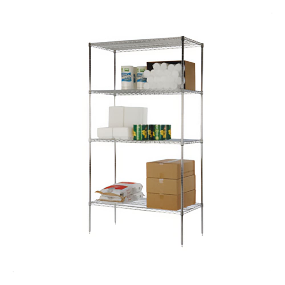 This shelving unit includes (4) 24" x 36" shelves and (4) 74" high shelf posts all with a chromate finish.