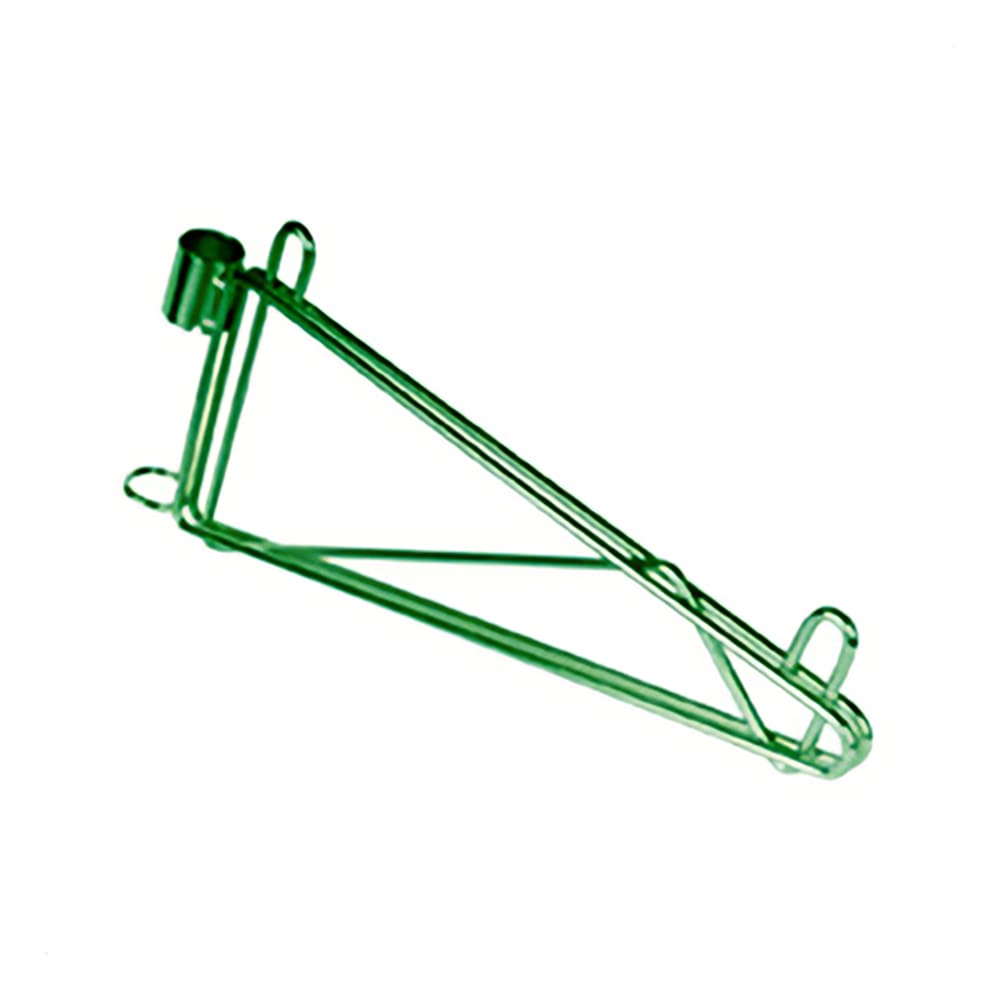 This green epoxy coated single direct mount wall bracket supports an 18" wide shelf. It includes a shelf support welded to a mounting plate with two shelf caps. Use single brackets at shelf ends and double brackets for adjoining shelves. Hardware to mount brackets to wall is NOT included. Please select according to type of wall. Order shelves separately.