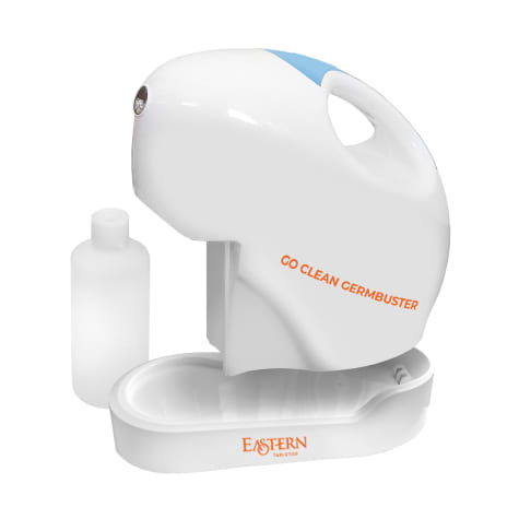 The Eastern Tabletop Mini GermBuster provides touchless 360° cleaning and kills 99.9% of viruses, germs, and mold on surfaces and in the air. Use in gyms, hotel rooms, and other areas. Use with Eastern Tabletop 3510 Germbuster 1 quart Go Clean Disinfectant (Item #: 6091588). Do not use with Clorox bleach or methanol alcohol.