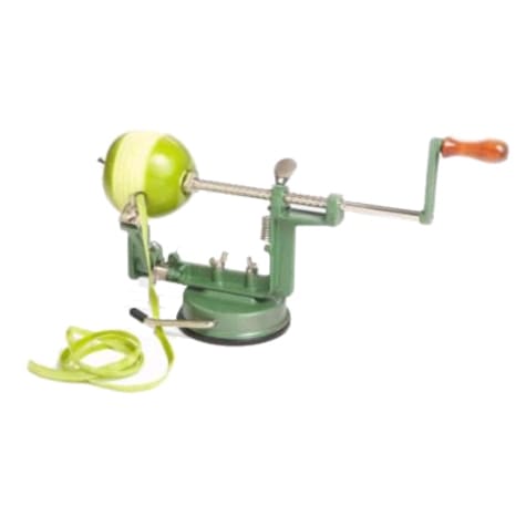This Fox Run™ Apple Machine can peel, core, and slice apples for desserts, snacks, and more. It is made from stainless steel and has a suction base.