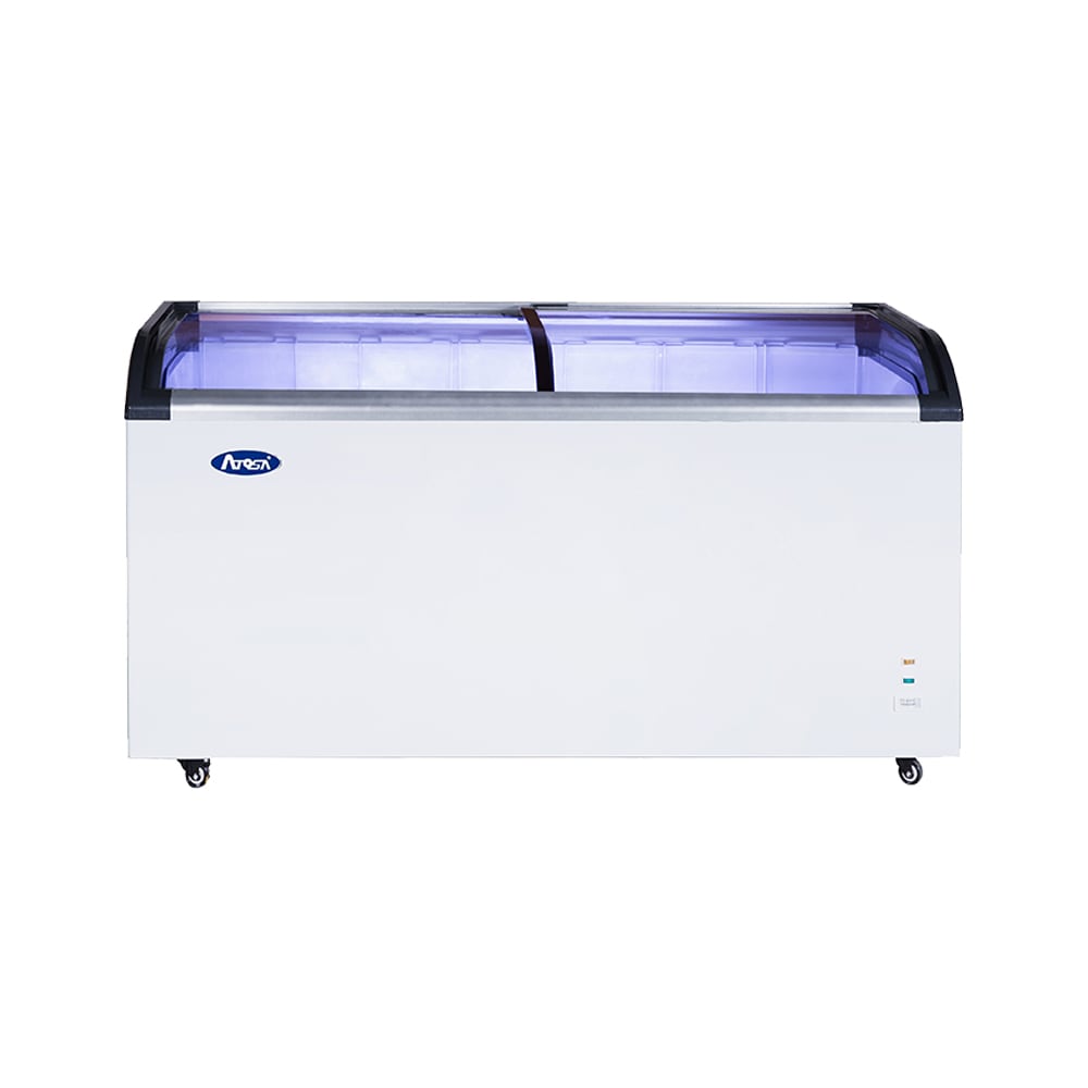 This Curved Glass Top Chest Freezer from Atosa is a 12.5-cubic-foot commercial freezer designed for efficient frozen storage and display. Featuring a locking curved glass lid, it provides visibility while ensuring security. The unit maintains a temperature range of -10°F to -1°F, ideal for preserving ice cream and frozen goods. Equipped with LED interior lighting, it enhances product presentation, while the four white epoxy-coated baskets offer organized storage. This unit uses environmentally friendly R290 refrigerant, ensuring energy efficiency. With pre-installed casters, including two with brakes, it allows for easy mobility and stability. This freezer is a reliable solution for businesses needing a durable and well-organized frozen storage unit.