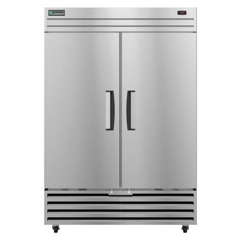 This Hoshizaki two‐section reach‐in freezer features a dependable 1/3 HP motor that powers the compressor in the bottom of this unit provides the cabinet with a continuous stream of cold air, keeping foods cold. It features epoxy coated wire coated wire shelves adjustable in 1/2" increments on aluminum supports, energy efficient interior led light bar, and the four 4" stem casters so it is easy to move.