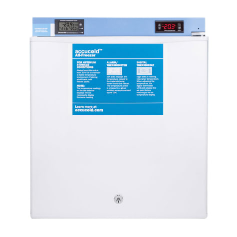This compact manual defrost all-freezer is designed for use on top of counters and is ideal for sensitive materials in medical, scientific, pharmaceutical, and laboratory institutions. This unit is designed with an external front control panel that allows users to adjust and monitor the temperature without opening the door and exposing stored contents to ambient temperature. A keyed lock offers security and a hospital grade 'green dot' cord provides added safety in high traffic environments.