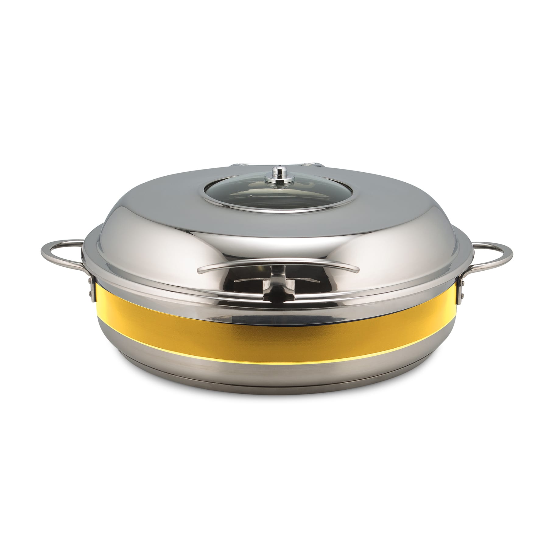 This 9 quart yellow French Pot from Bon Chef is part of the Classic Country French Collection and combines an attractive design with functional construction for the ultimate line of efficient, easy to use cookware. It interweaves 5 layers of highly conductive aluminum and stainless steel for optimal even heat distribution. This pot is induction‐ready and works with your induction stoves for fast, even heating. It is also ideal for steam tables and cold wells.