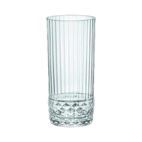 This cooler glass is part of the America '20s Collection from Bormioli Rocco.These 1920s-inspired glasses bring the glamour of trendy American jazz bars through to today. Where conversation was about art and the ambiance was of unprecedented newness and enthusiasm. All the products are characterised by an elegant and original vintage style, in line with the latest trends, and are embellished with dense facets that develop precious light effects, enhancing the colors of cocktails and drinks.