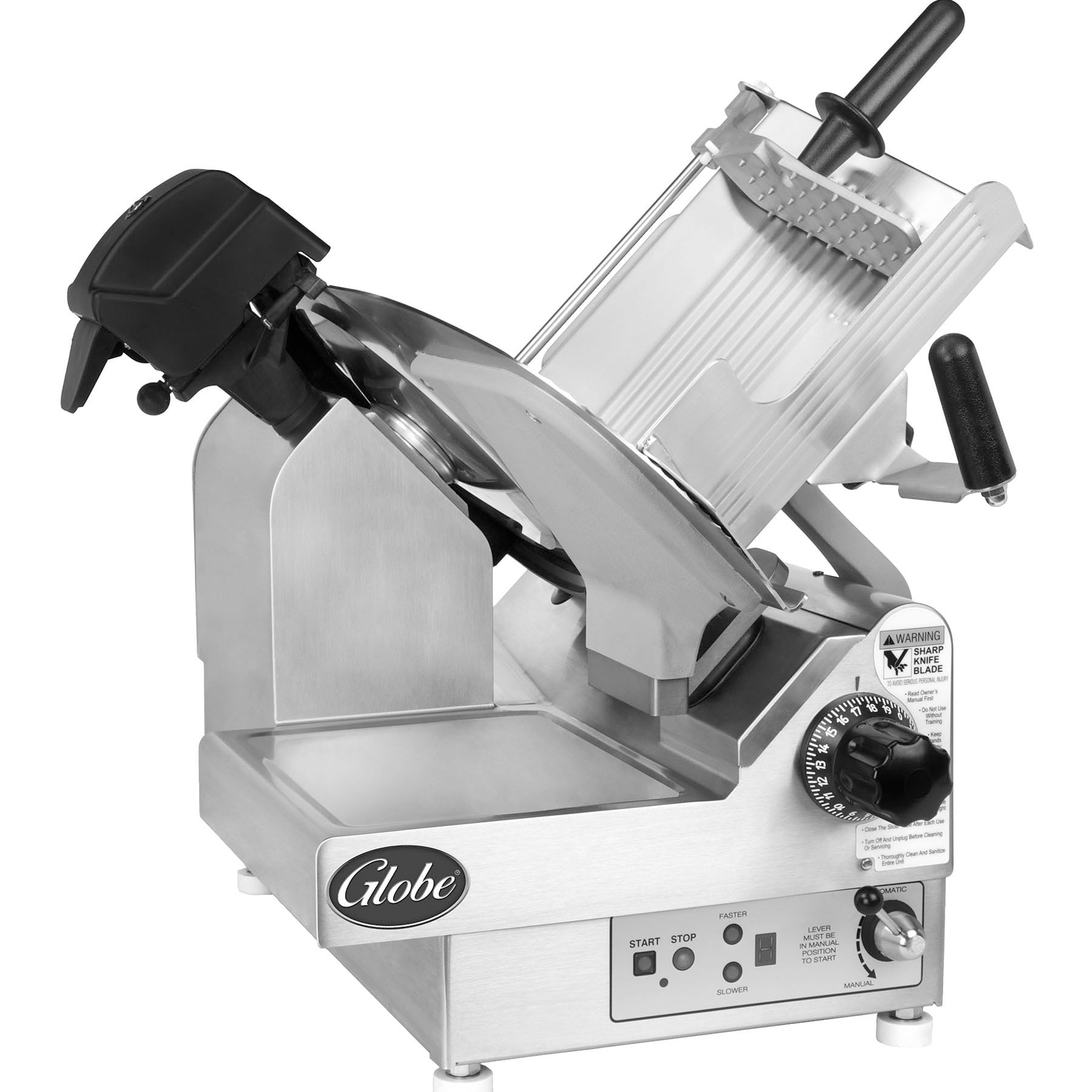 The Globe Food 4975P 9‐speed slicer has the Precise Edge™ knife to make slicing cheese and meats easy. This slicer has many safety features such as table lockout when the knife cover is removed to protect the operator.
