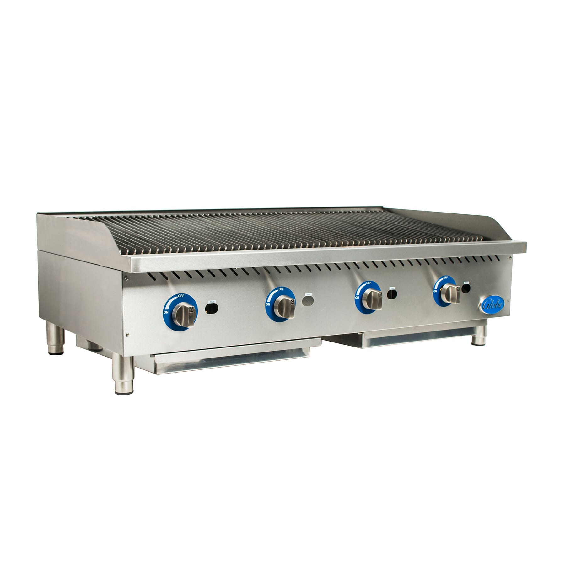 The stainless steel U‐style burners of this Globe Food 48" Char rock Gas Charbroiler provides flames every 6 inches. With the cool‐to‐touch stainless steel front and easy‐to‐remove catch tray, you will find using this charbroiler easy and safe.