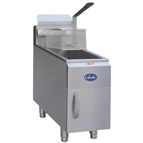 You get two heavy duty fry baskets with this Globe Food LP Gas Fryer. The single pot has a drain valve and extension pipe.