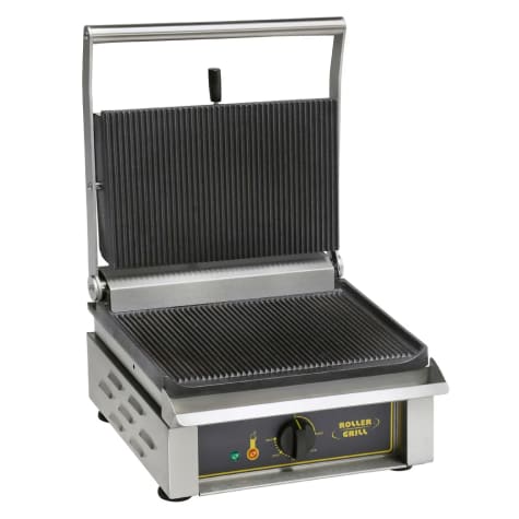 This heavy duty panini grill is perfect for every toasting and grilling application. It features fine grain cast iron smooth plates with even heat distribution for toasting multiple sandwiches at the same time. Stainless steel construction for durability and easy cleaning.