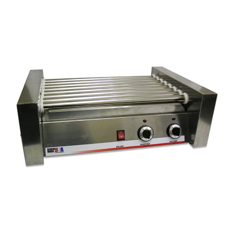 This high quality roller grill from Winco® features stainless steel construction, removable drip tray and non-stick rollers for ease of cleaning. It also features a high-torque motor and the 360 degree roller rotation ensures evenly cooked hot dogs.