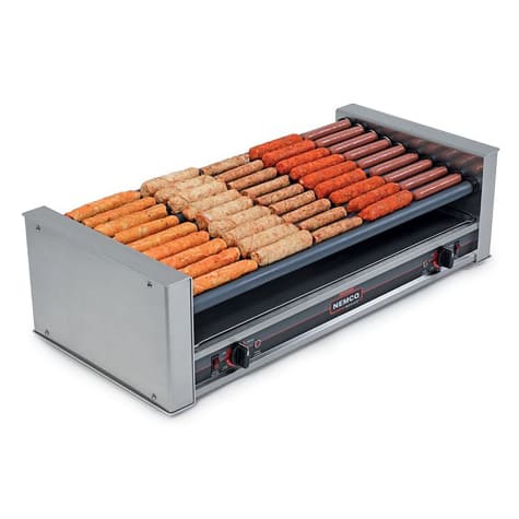 This slanted hot dog roller grill from Nemco® features a special tiered roller design that adds an effective merchandising edge, because it brings the deliciously tempting grilled hot dogs into better view for your customers.