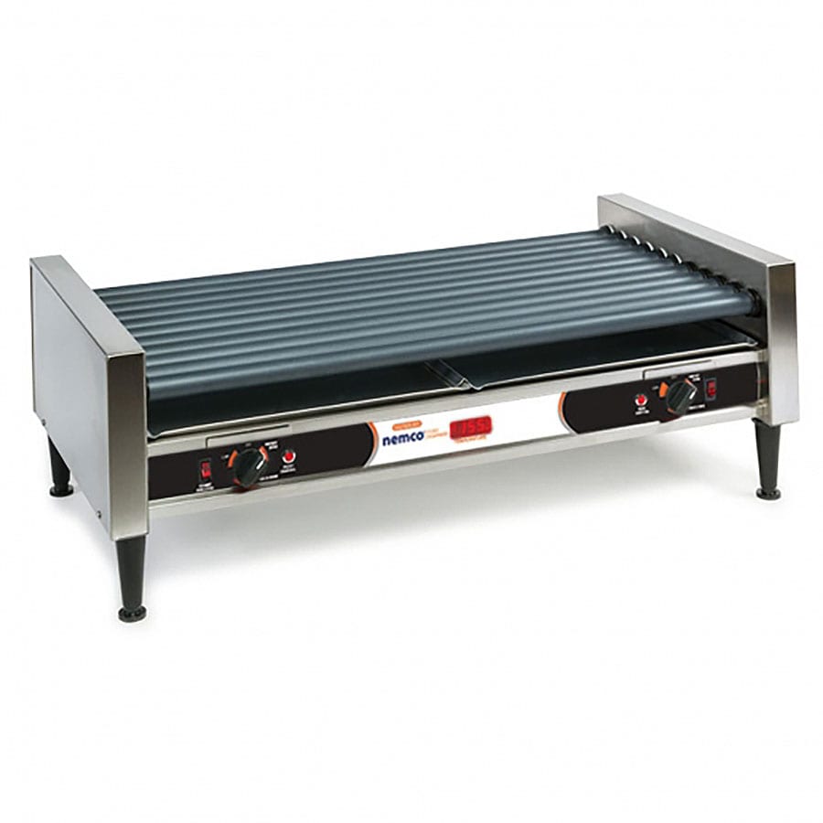 This slanted hot dog roller grill from Nemco® features a digital readout that displays the approximate food temperature of the product for both zones. The 360° roller rotation prevents residue buildup, while individual roller heating elements ensure heating consistency. The removable drip pan makes for easy cleaning and the infinite controls offer versatile temperature control. Front and rear rollers have their own heat controls. This feature permits shutting off one section during non peak hours.