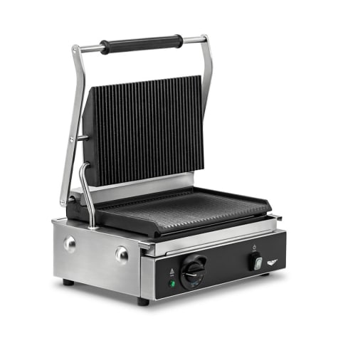 You will enjoy making your favorite grilled sandwiches using this Vollrath cast iron panini grill. It features a compact design that saves space and at the same time, provides great results for sandwiches and other foods. The grooved cast iron plates provide superior heat retention and create perfect grill marks for an attractive presentation. The dual pivot‐action top plates adjust to different food thicknesses, ensuring flawless cooking every time.