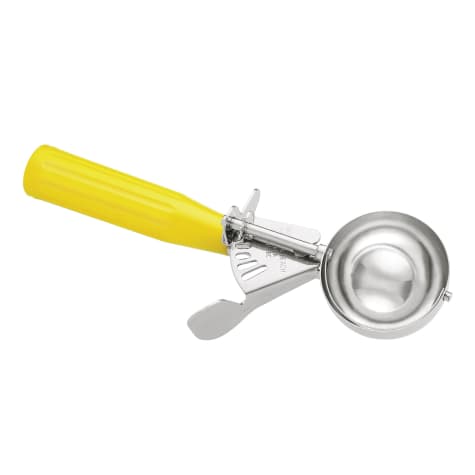 Scoop the perfect portion with this yellow handle portion control disher from Darling Foodservice.