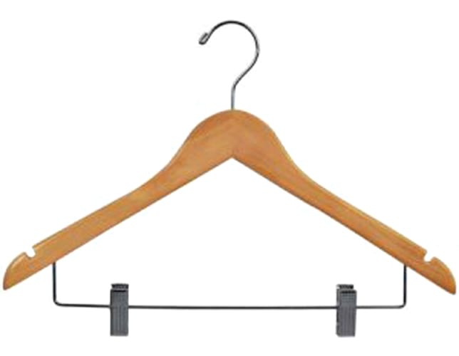 These sturdy, well-constructed hardwood hangers from Hangers Direct® feature a space-saving flat body, two carefully crafted notches for the option of hanging straps, and a polished chrome swivel hook. This style also features two polished chrome clips with clear anti-stain cushions for hanging pants, skirts or other coordinate pieces. Finished with a double coating of lacquer to prevent splintering, these high quality, low cost hangers have been manufactured to last you a lifetime. Great for strap tops, skirts, ladies suits and dress shirts!