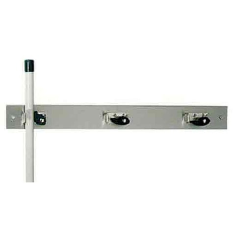 This stainless steel mop hanger from John Boos will help keep your janitorial supply closets neat and organized. It holds up to 3 mops or brooms for quick and convenient access.