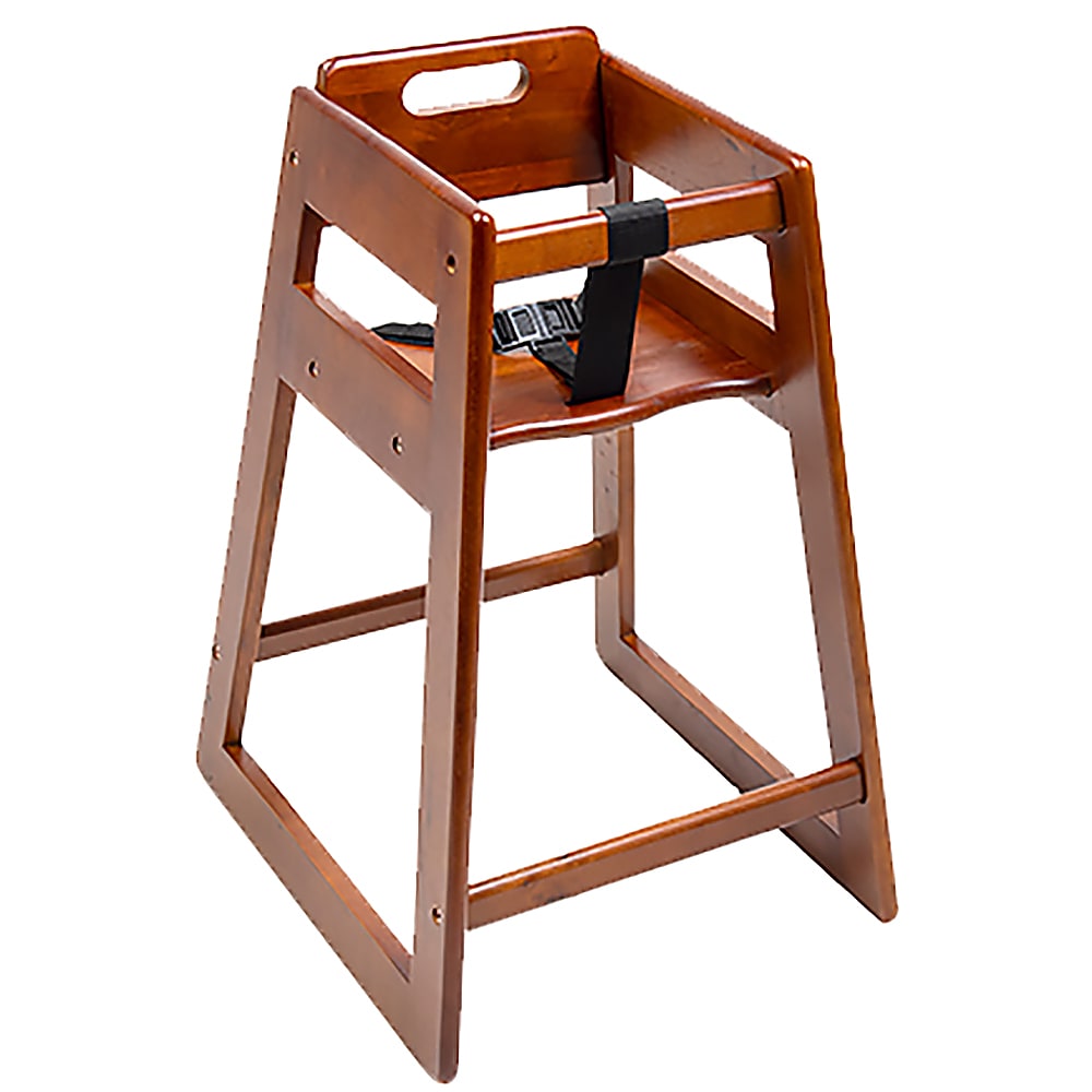 This dark wood stacking high chair from Central Specialties is stackable and design to keep little ones safe while dining. The A‐frame design provides a sturdy base and the seat belt with crotch strap holds children securely.