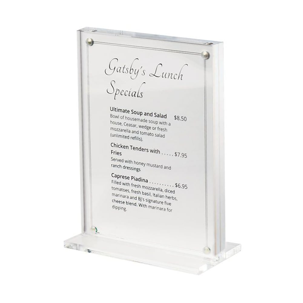 The Cal-Mil 3567-46 Clear Card Holder is a practical and stylish solution for displaying 4 x 6 cards. Its two sides come apart easily for quick signage changes, and strong magnets ensure the card stays in place. The wide base provides stability, making it perfect for any tabletop display.