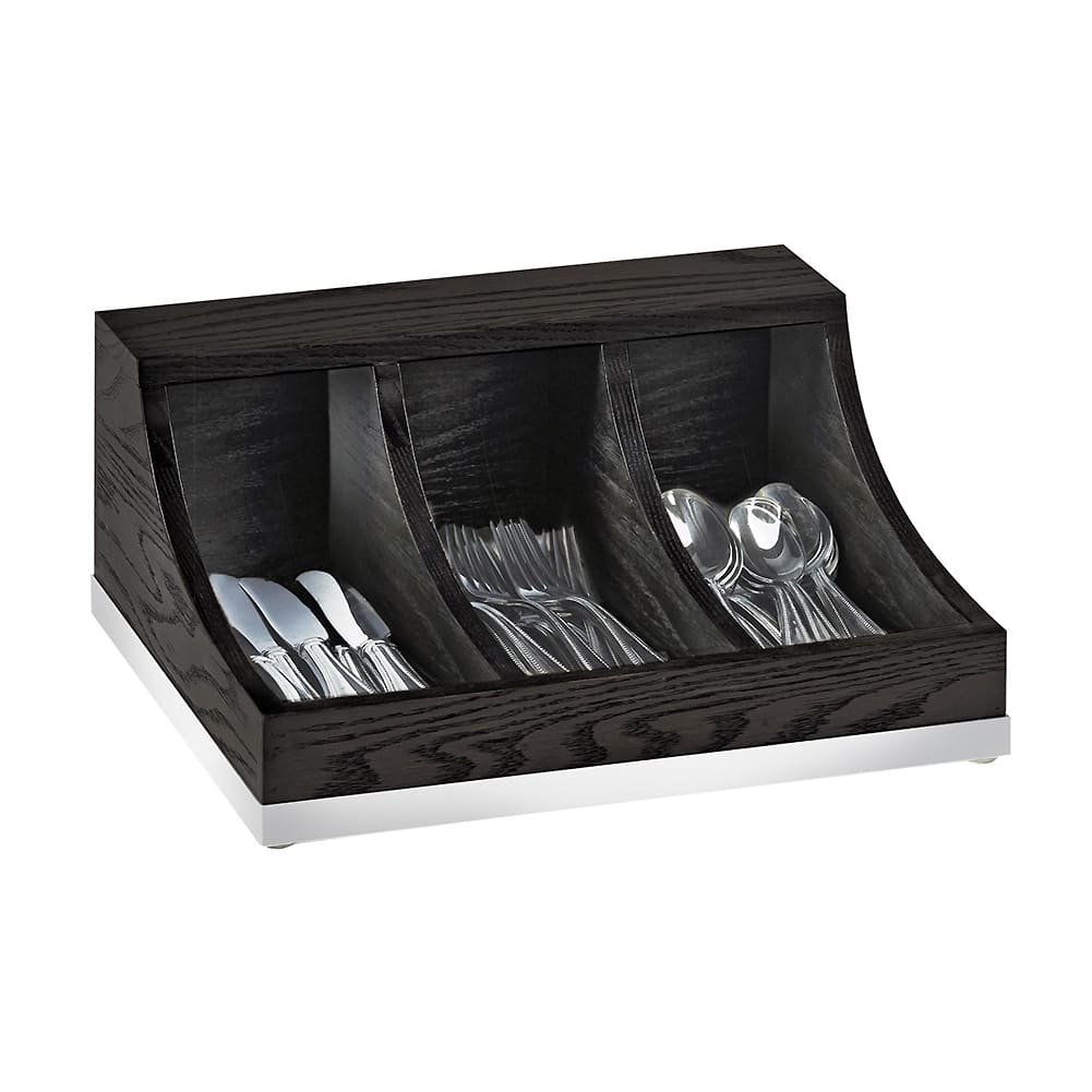 The Cal-Mil 3802-87 Cinderwood Flatware Organizer features a durable gray-stained oak construction with an open-faced front for easy access. It has three sections to separately house forks, spoons, and knives, and its gentle curves and mirrored square accent add a modern, elegant touch. This organizer is perfect for keeping flatware neatly arranged and easily accessible.