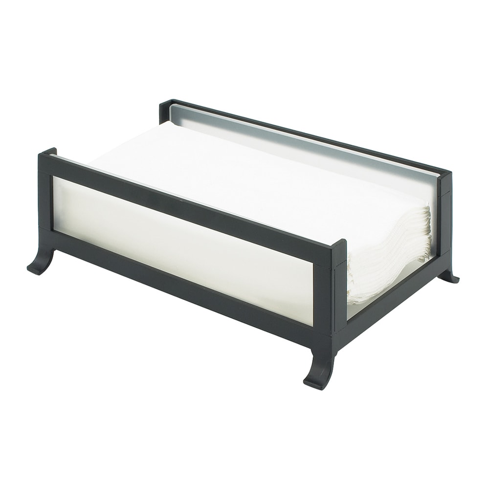 The Cal-Mil 1588-33 is a Soho black napkin holder with frosted glass sides, designed to add a chic touch to your tabletop setting. Measuring 9 3/8" x 6 1/4" x 3 1/2", this holder accommodates 4" x 8" napkins and features a sleek black frame with two frosted glass panels. The open sides allow for easy access to napkins, while the raised feet protect them from spills. Perfect for cafes, coffee shops, bars, and restaurants, it combines style and functionality to impress your guests.