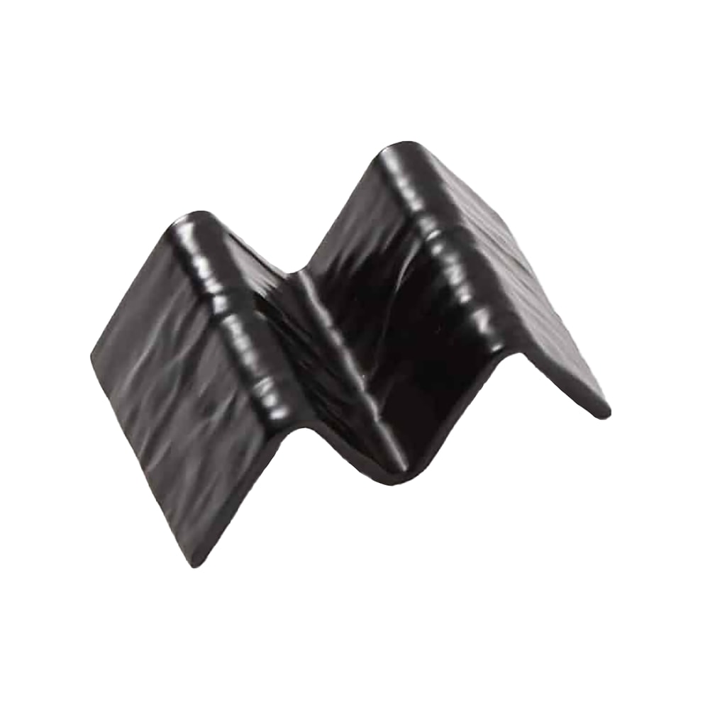 This black faux slate melamine taco holder is perfect for presenting tacos in style. Measuring 5 inches in length, 3 inches in width, and 2 inches in height, it features 1 or 2 compartments depending on which side is facing up. The durable, dishwasher-safe melamine construction ensures long-lasting use, making it ideal for both casual and formal dining settings.