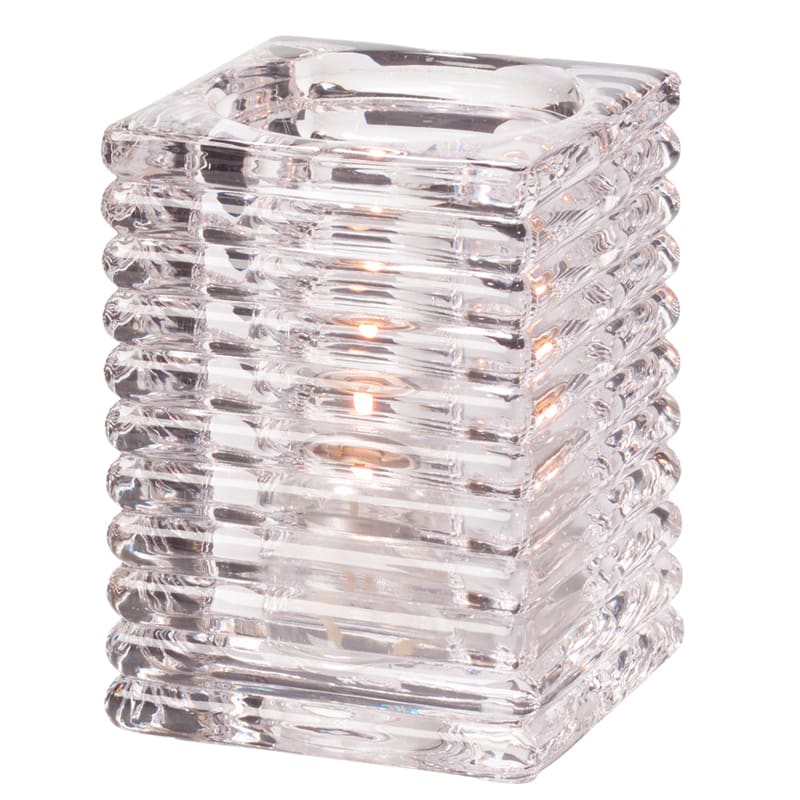 This clear 4‐1/8" H X 2‐7/8" Sq. glass tealight block lamp provides your tabletop with a crisp glow and a touch of sophistication with its horizontal rib design. You can use it with Hollowick's disposable fuel cells which don't leave any waxy mess like a candle would, and Hollowick's FX Flickering LED Tealights for a more dramatic and longer lasting glow.