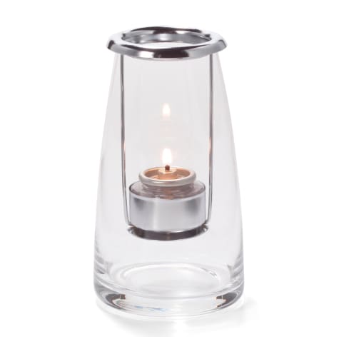 This beautiful glass Lighthouse Lamp from Hollowick feature a sleek design and a hanging tealight holder, bringing a unique vertical element to the table while casting an appealing illumination upon the tabletop.
