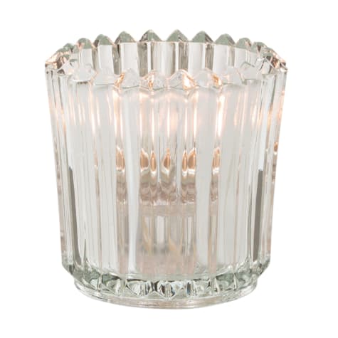 This Hollowick glass tealight lamp features a clear, ribbed pattern provides your tabletop with an elegant, yet simple design.