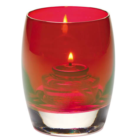 Contour votives add a fine dining touch to any setting. This votive has eye‐catching, contemporary shape with heavy base in a ruby lustre color.