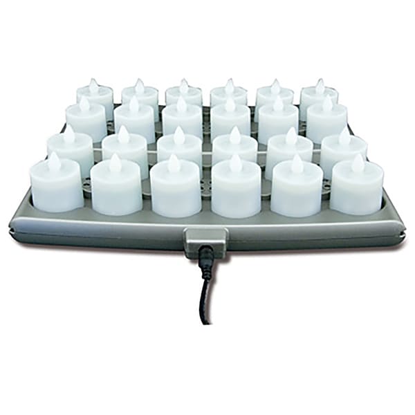 This Flameless Candle Set features a linkable pin charging system so that up to four power trays may be linked together, allowing you to charge up to 48 candles per adapter. These commercial rechargeable systems are designed to charge each candle as needed and to adequately keep each candle unit fresh.