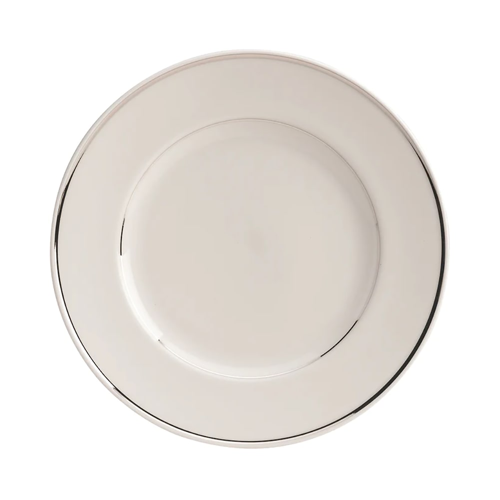 This 9" plate features the Seville shape that features a thin profile, organic appeal, and sculptural elements that provide a sleek style. Part of the Platinum pattern, this plate also features a silver banded rim.