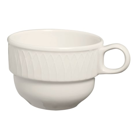This 7 ounce mug features a convenient stacking shape that saves you storage space and a sculpted lattice design on the cup that adds elegance to your coffee service.