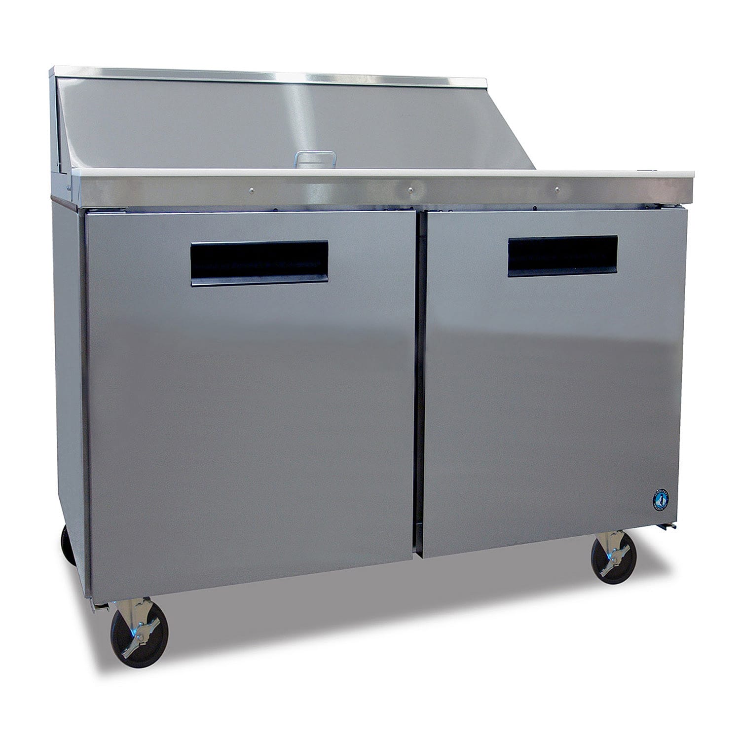 This Mega top refrigerator has a unique air distribution duct distributes air evenly to maintain product temperature. The door has a stay open feature so the contents are easy to access and the top has a full length cutting board and 12 ingredient pans.