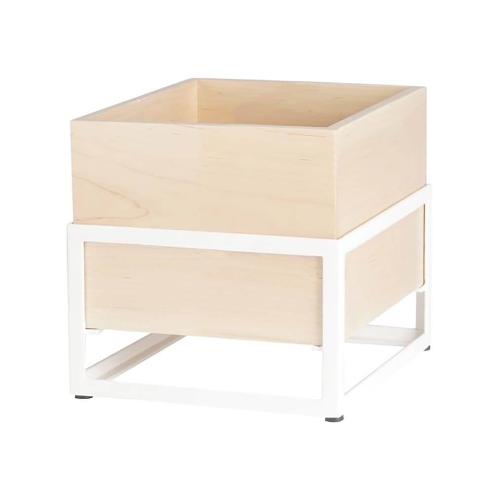 The Cal-Mil 22362-6-15 is a compact and stylish ice housing unit. It features a maple wood pan and a white metal frame, measuring 6.75" x 6" x 7.75". This unit includes a plastic condensation liner to keep ice runoff contained, making it perfect for displaying and chilling beverages at buffets or events.