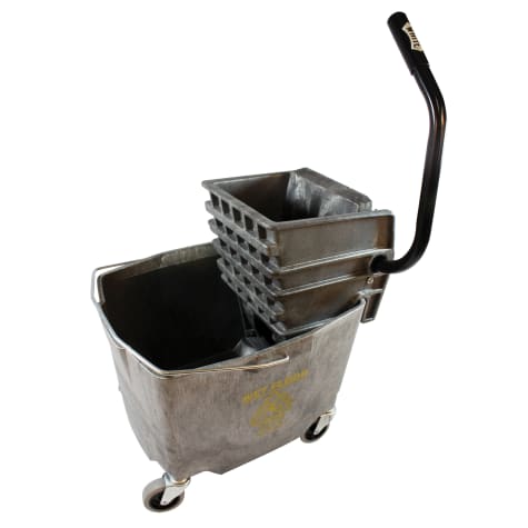 This Sidepress Combo Bucket makes a great addition to a variety of businesses. It features structural foam construction, and has reinforced nylon bearings for smooth operation. It also includes a splash guard to eliminate messes, and has an inboard caster configuration to prevent walls from marring during use. It holds 26-35 quarts.